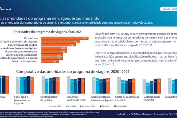 A BCD Travel realiza constantemente pesquisa com os Gestores de Viagens para entender suas necessidades e pontos de atenção. Veja o resumo das atuais prioridades dos programas de viagens e as principais mudanças entre janeiro de 2020 e outubro de 2021.